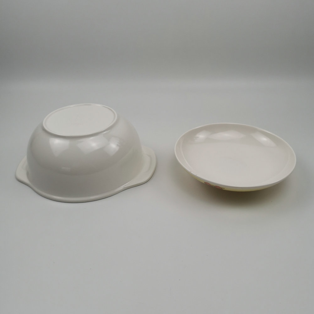 Cute shape custom color to meet children's curiosity; The edges are smooth and shiny. Environmental protection, durable, strong pressure resistance, not easy to break; Melamine tableware is resistant to acid and alkali and is not easily corroded. Food grade melamine material, healthy and safe material, natural health, non-toxic and odorless, protect baby health. The bowl body is added with floral paper, the use of plant-based ink, food grade printing process, to better protect your diet health. Double ear design, hold between the heat insulation.